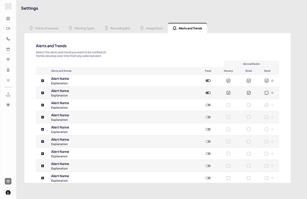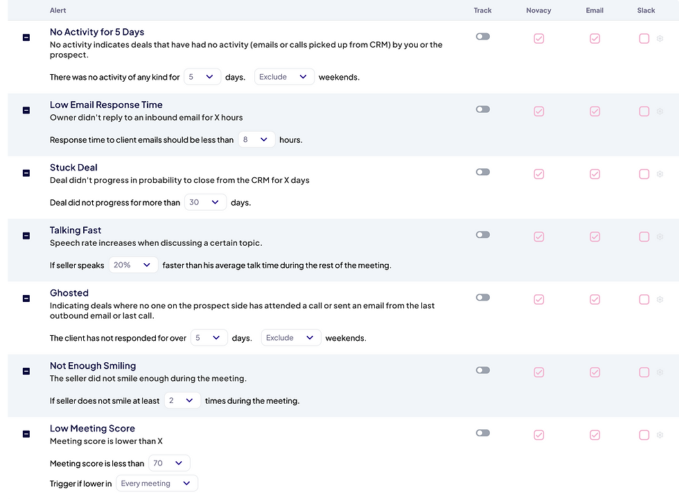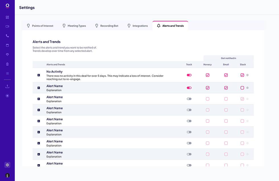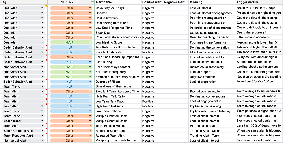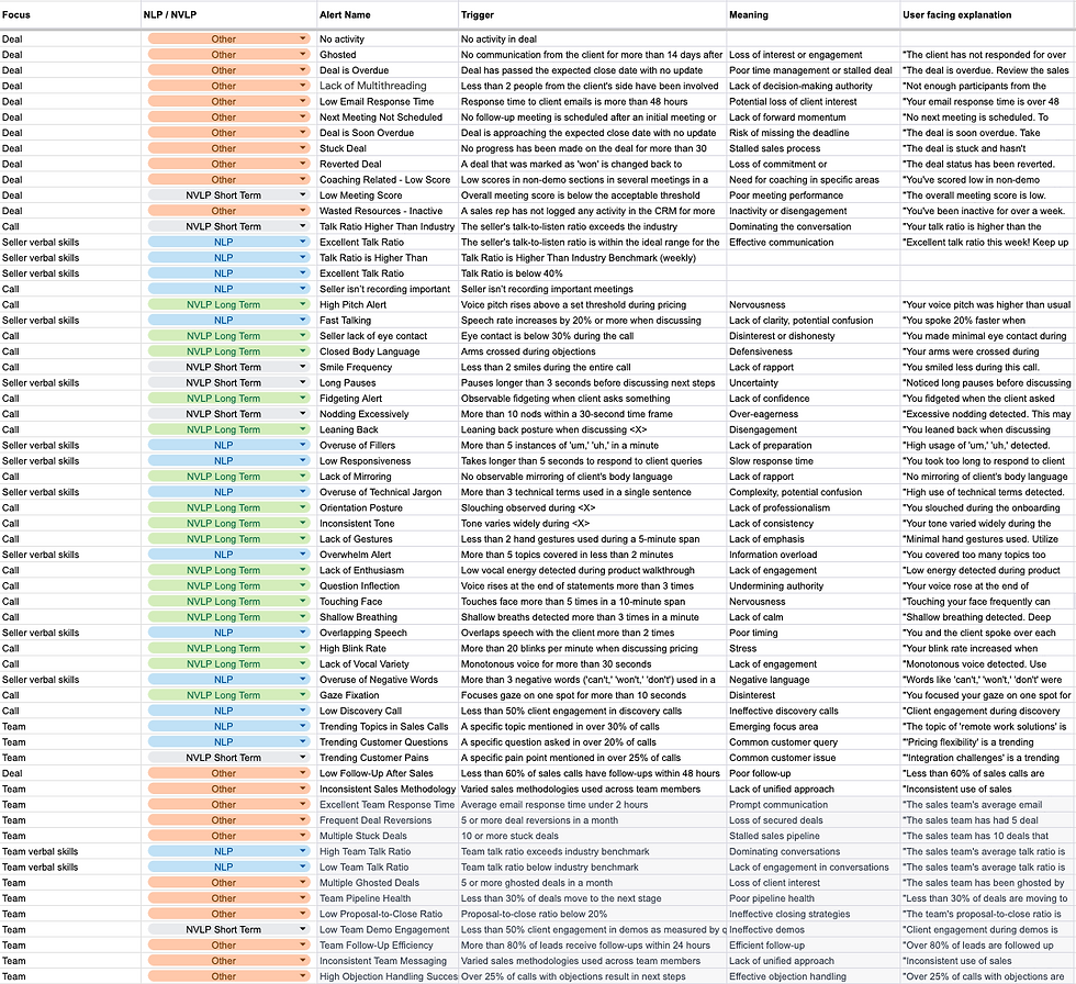 In collaboration with Novacy's CPO, we mapped out 60 different types of alerts and trends that can occur during a deal's lifecycle, covering verbal, non-verbal, and other interactions.
