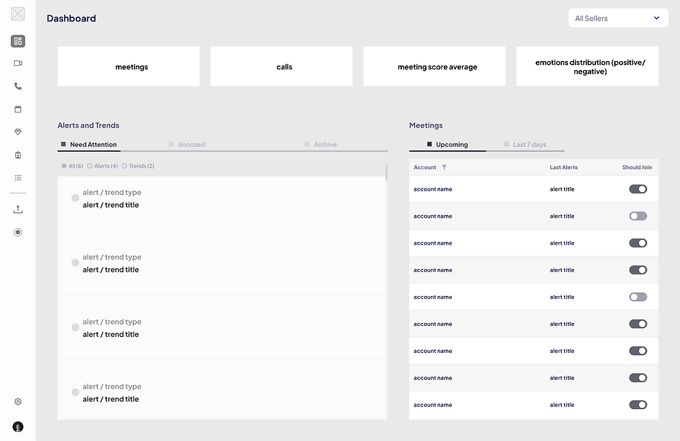 To help sales managers better understand seller-buyer communication, we designed a dashboard with an "inbox zero" email approach and alerting system. This allows managers to quickly address, snooze, or archive alerts and insights on issues, meetings, and rep performance metrics in a centralized view.
